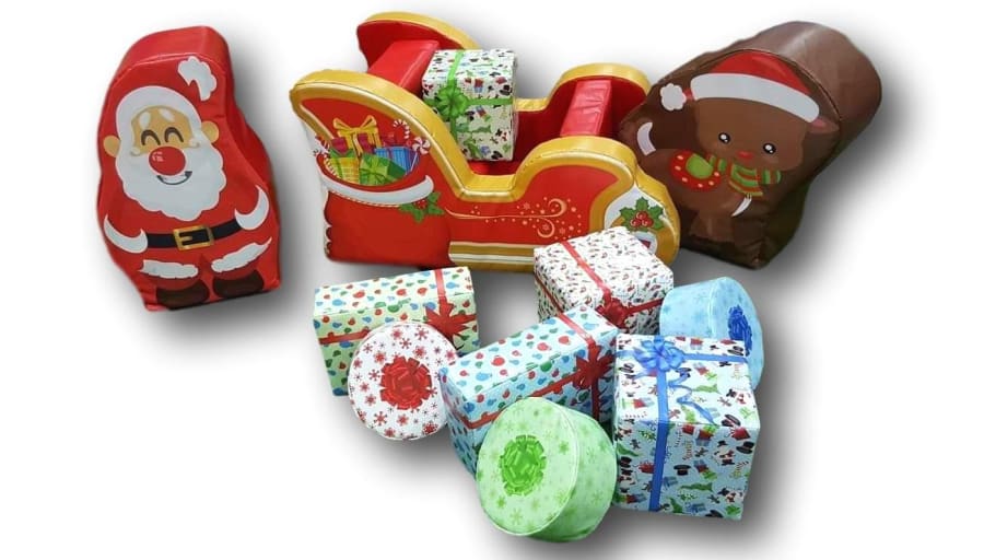 Come get in the spirit of Christmas with this amazing sleigh and reindeer soft play set, this lovely set comes with Reindeer, Santa and soft play presents. Great for babies and toddler groups, as well as fetes and festive functions.