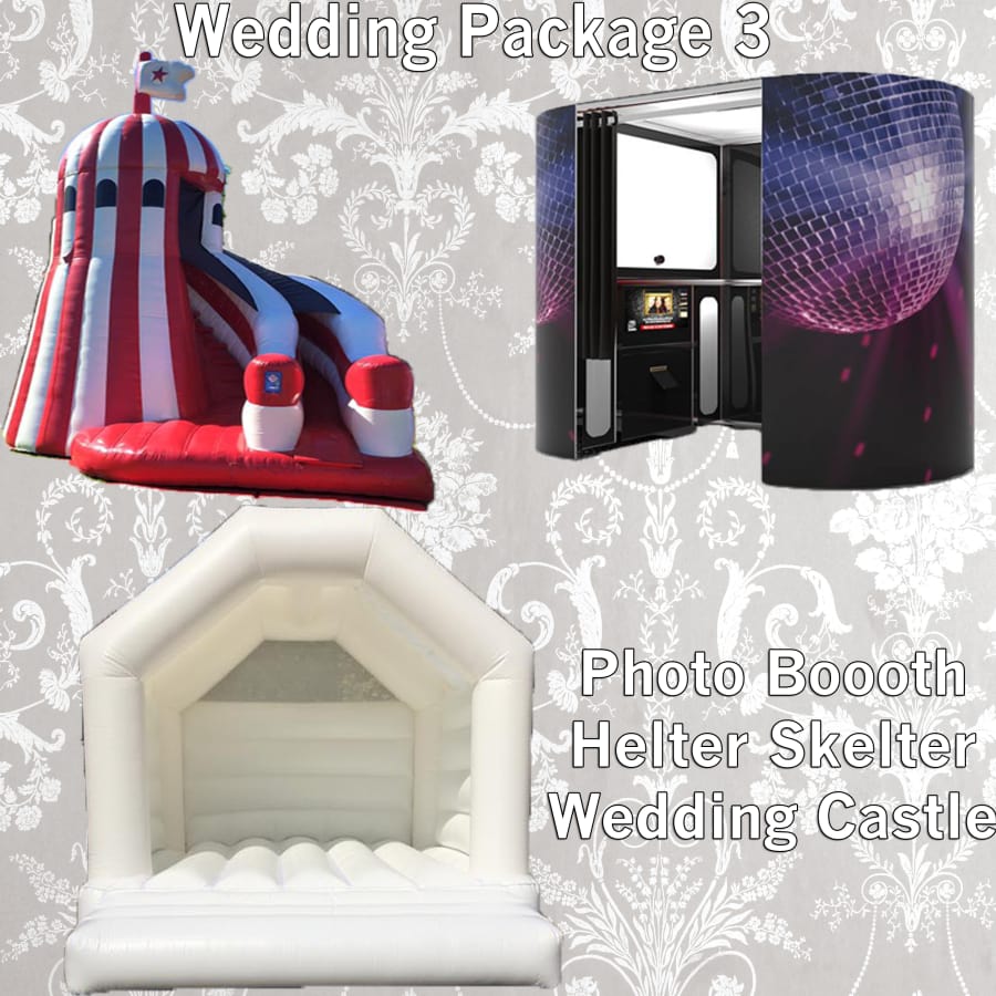 Our fabulous White Wedding Castle, fantastic Photo Booth and our amazing Helter Skelter Slide!