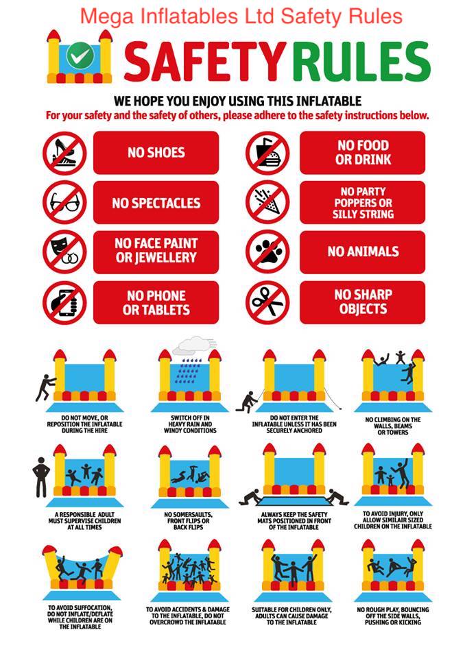 - Mega Inflatables Ltd is not responsible for any injury or damage incurred by persons or property during the hire period.