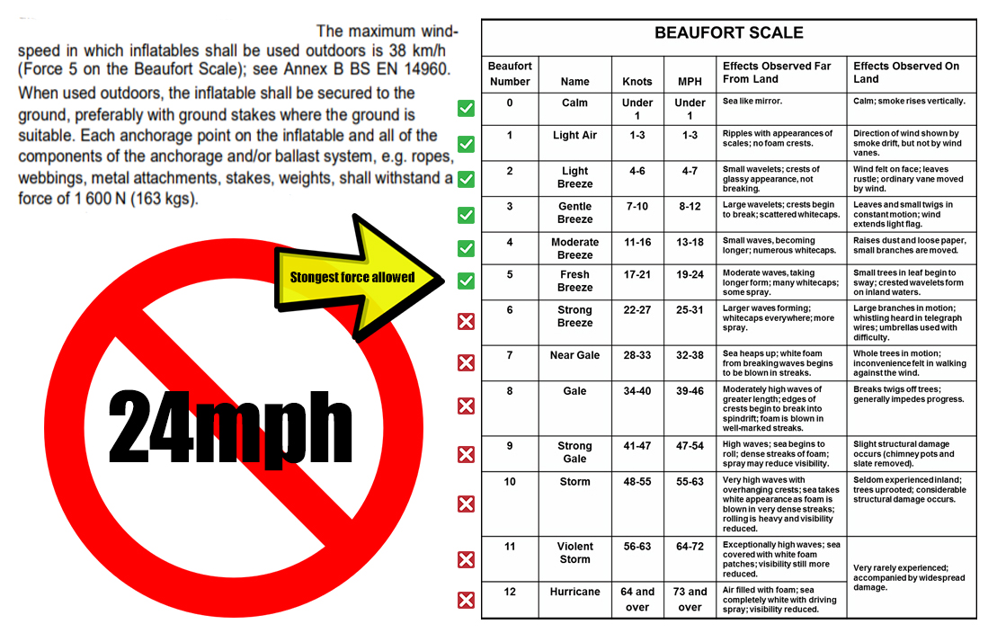 We reserve the right to cancel due to extreme weather conditions or any other unforceen circumstance. Inflatables cannot be used outdoors when wind speeds are expected to be 24mph and above. This includes predicted guest speed as detailed in the current European standard.